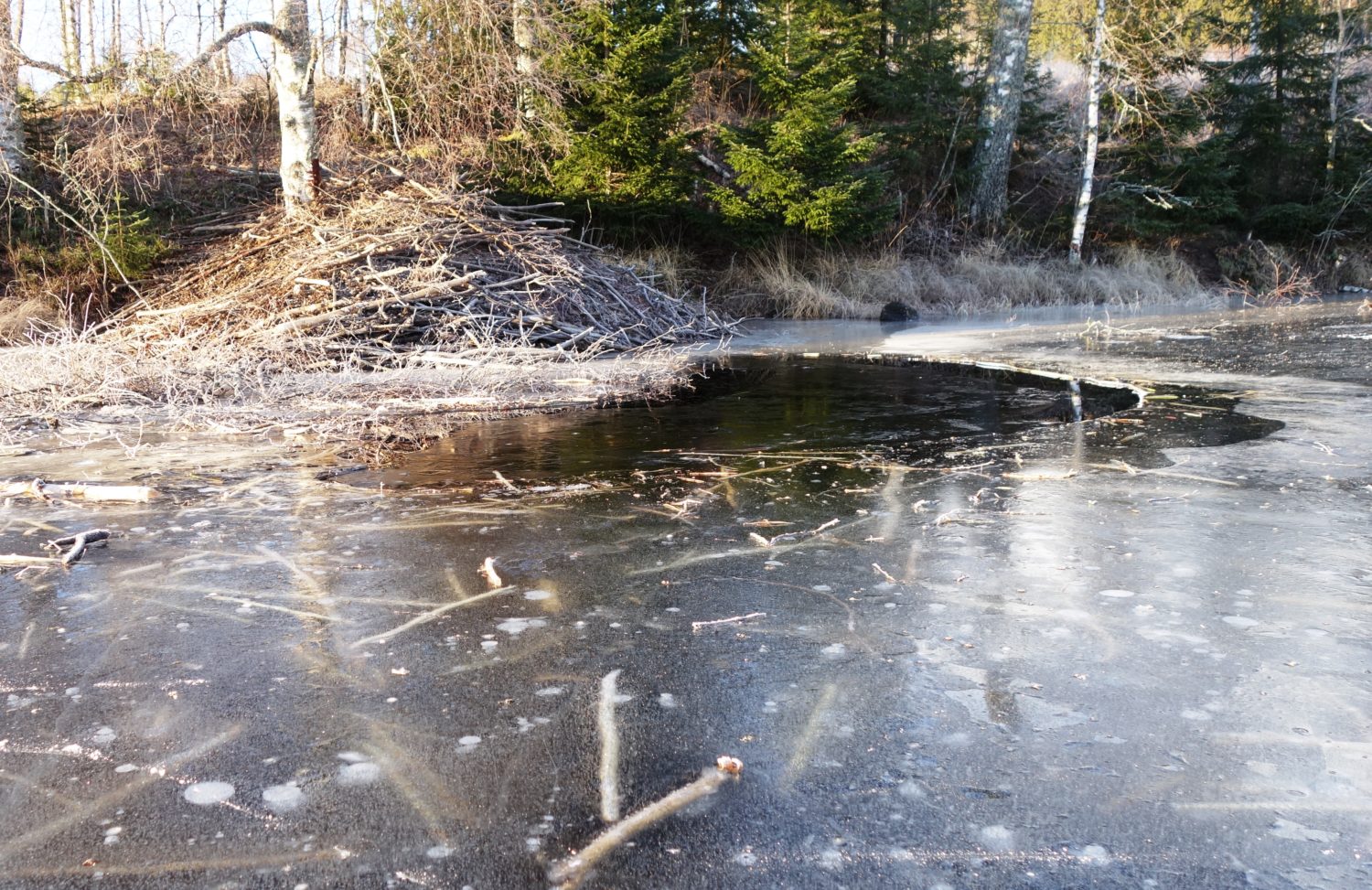 Nordic skating isn’t just the joy of skating. It gives you such wonderful nature experiences. We met a squirrel, followed some ravens and passed by a beaver hut. You could see the activity of chopped birches and the open water outside the hut. The beavers are really social animals. Inside the hut the family has different rooms where they spend their days and nights during winter time. The entrance to the hut is below the water surface to keep predators away.