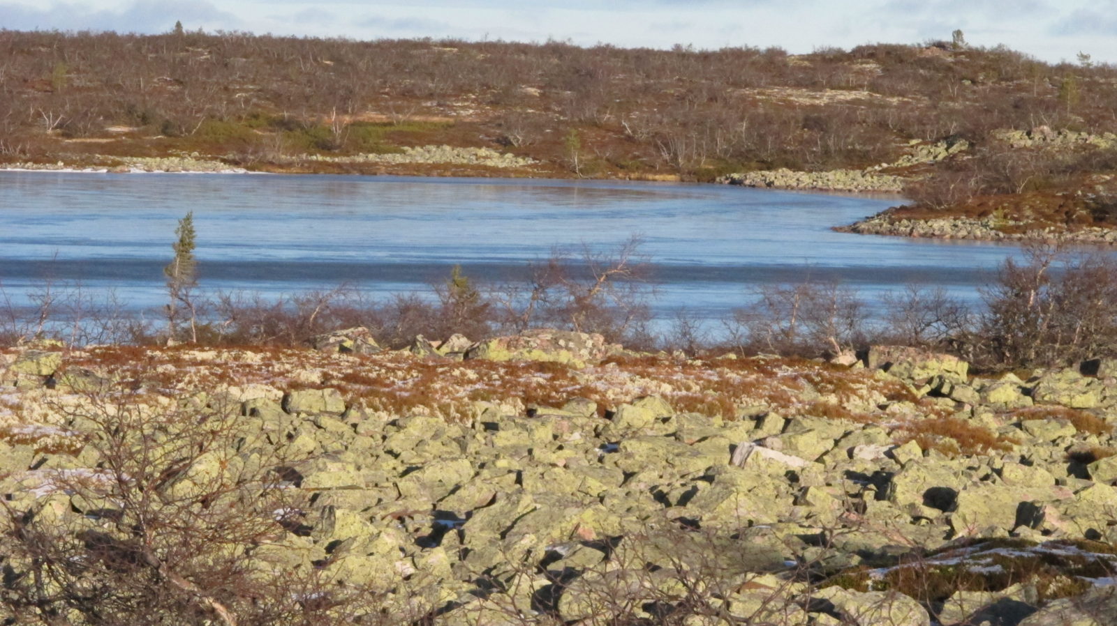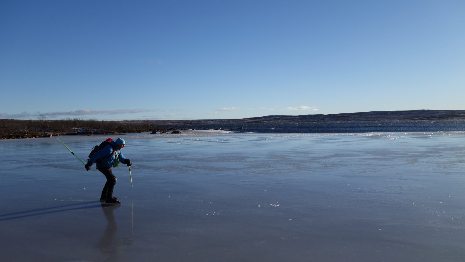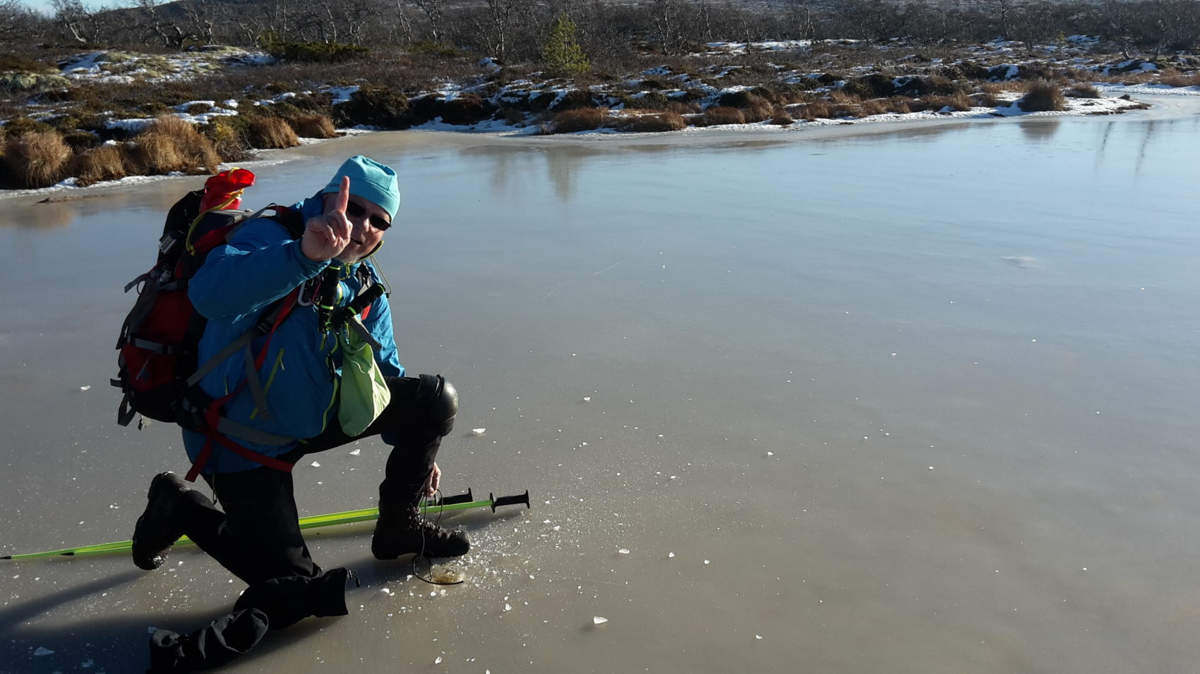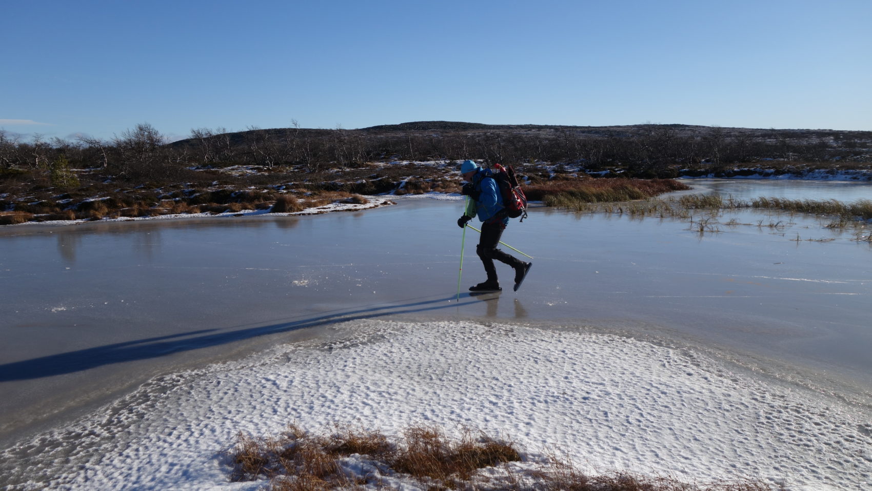 The day was sunny, with a clear blue sky and no clouds. A bit windy and some degrees below zero. A good sign. A big herd of reindeer met us on our hike uphill. We found what we were looking for. A frozen pond, big enough with ice thick enough to skate on for a while for beginners.