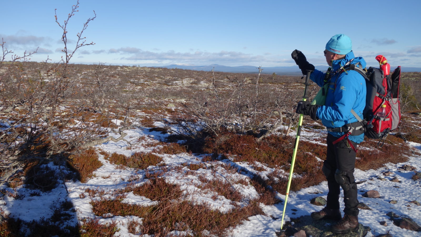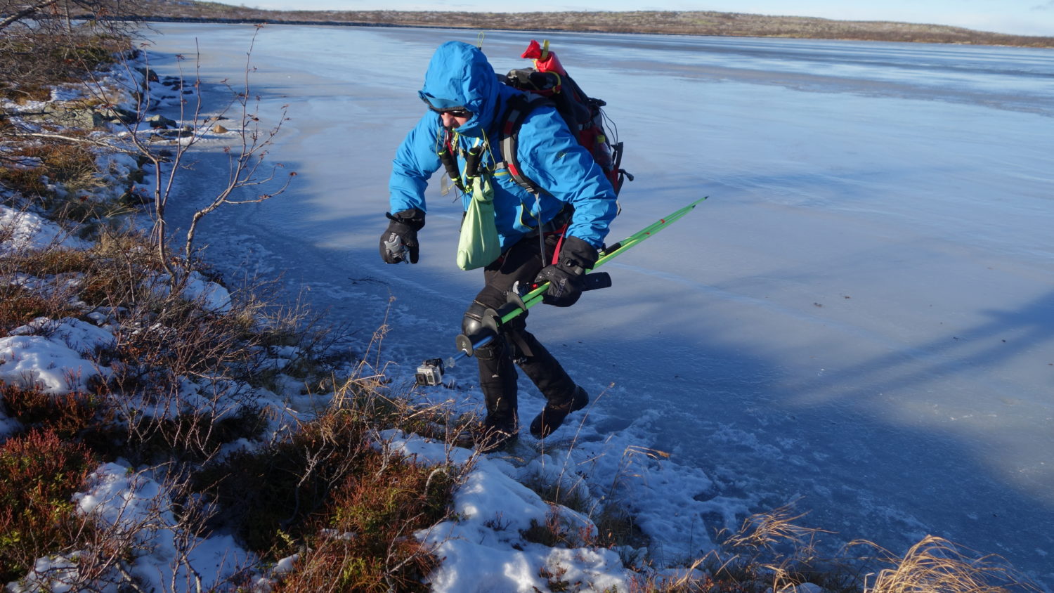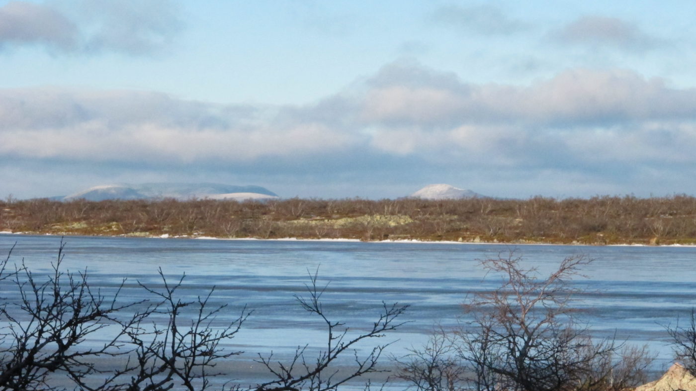 The day was sunny, with a clear blue sky and no clouds. A bit windy and some degrees below zero. A good sign. A big herd of reindeer met us on our hike uphill. We found what we were looking for. A frozen pond, big enough with ice thick enough to skate on for a while for beginners.