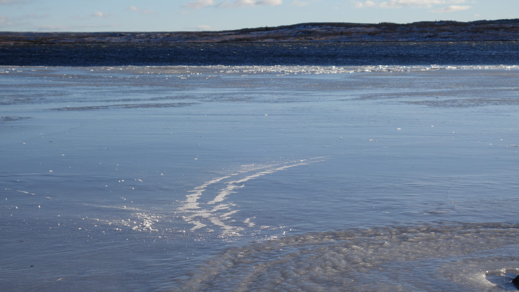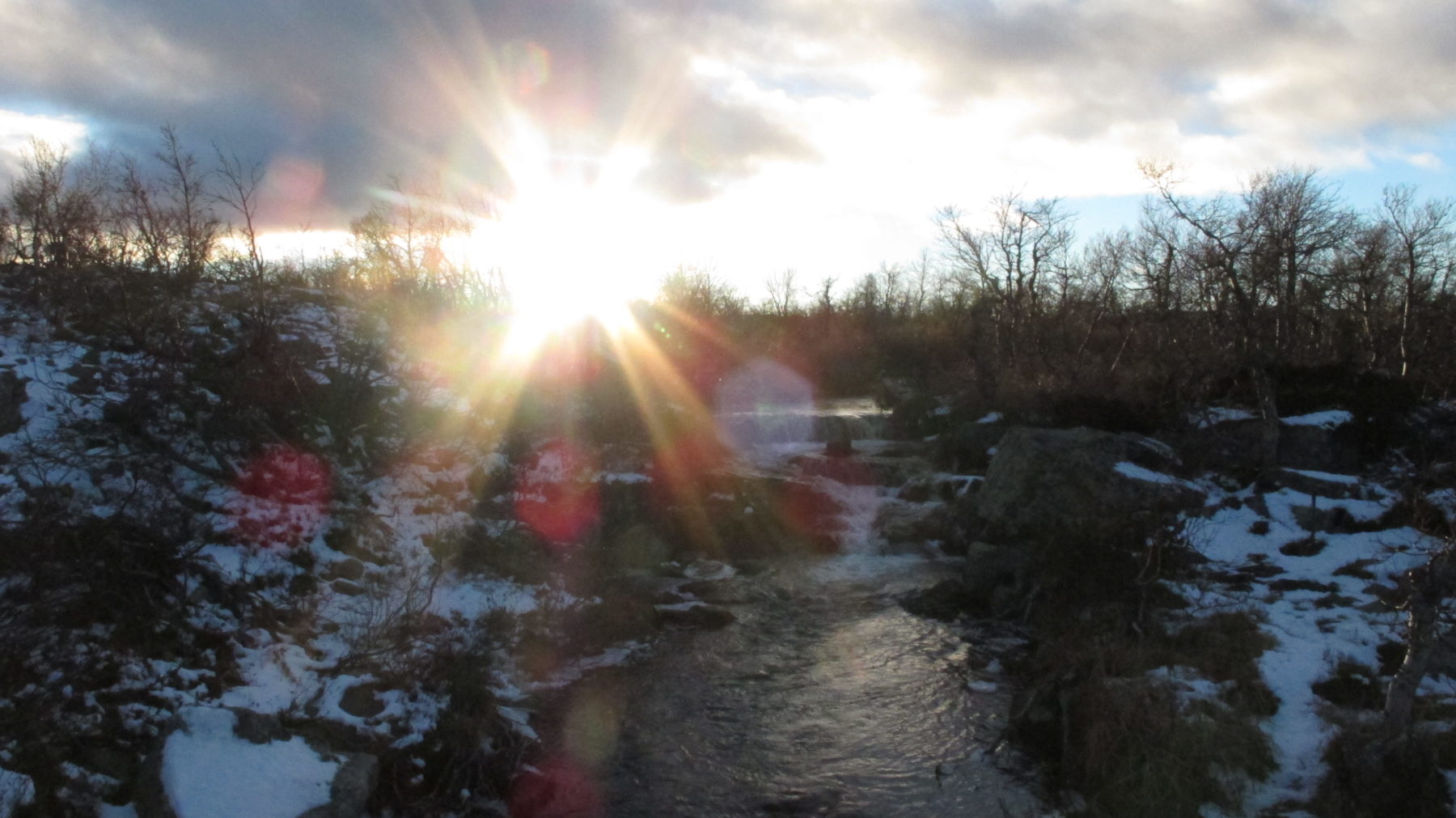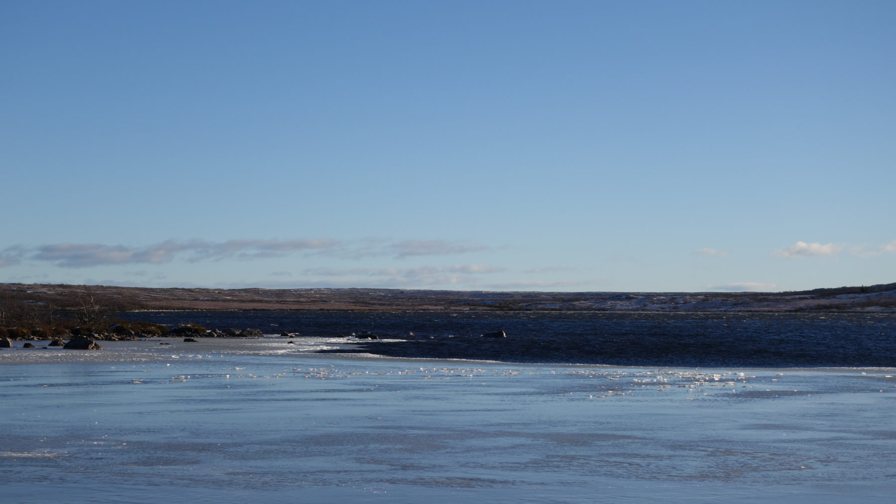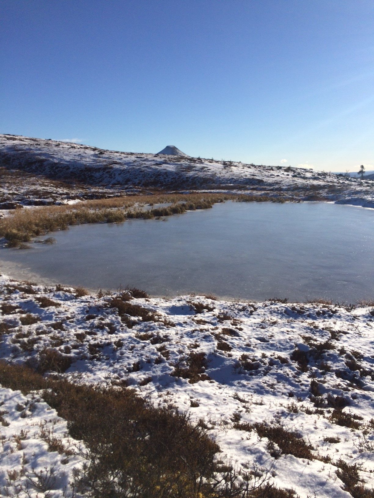 The day was sunny, with a clear blue sky and no clouds. A bit windy and some degrees below zero. A good sign. A big herd of reindeer met us on our hike uphill. We found what we were looking for. A frozen pond, big enough with ice thick enough to skate on for a while for beginners.