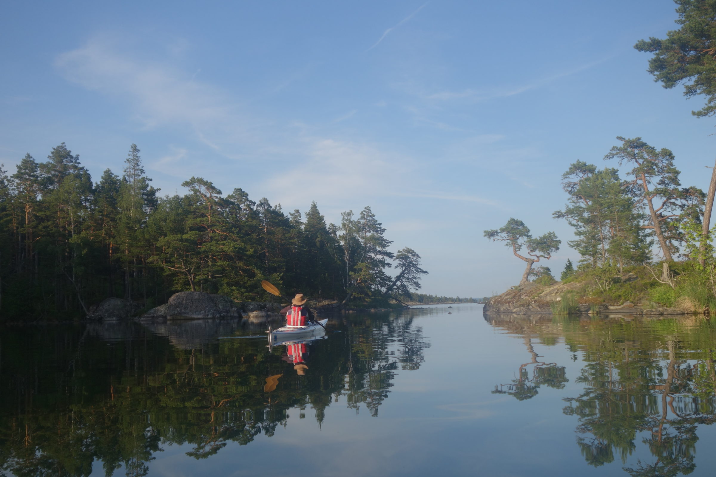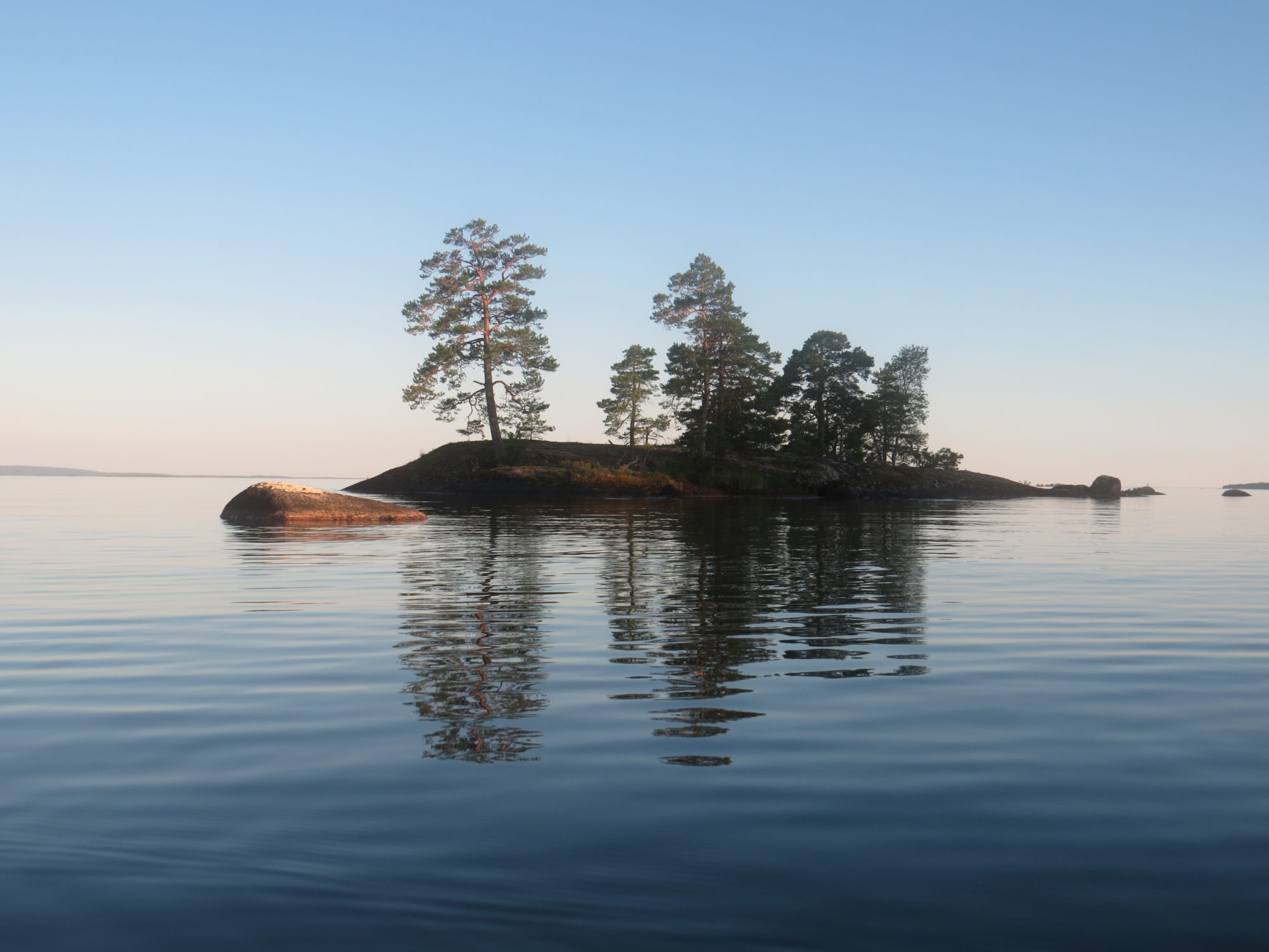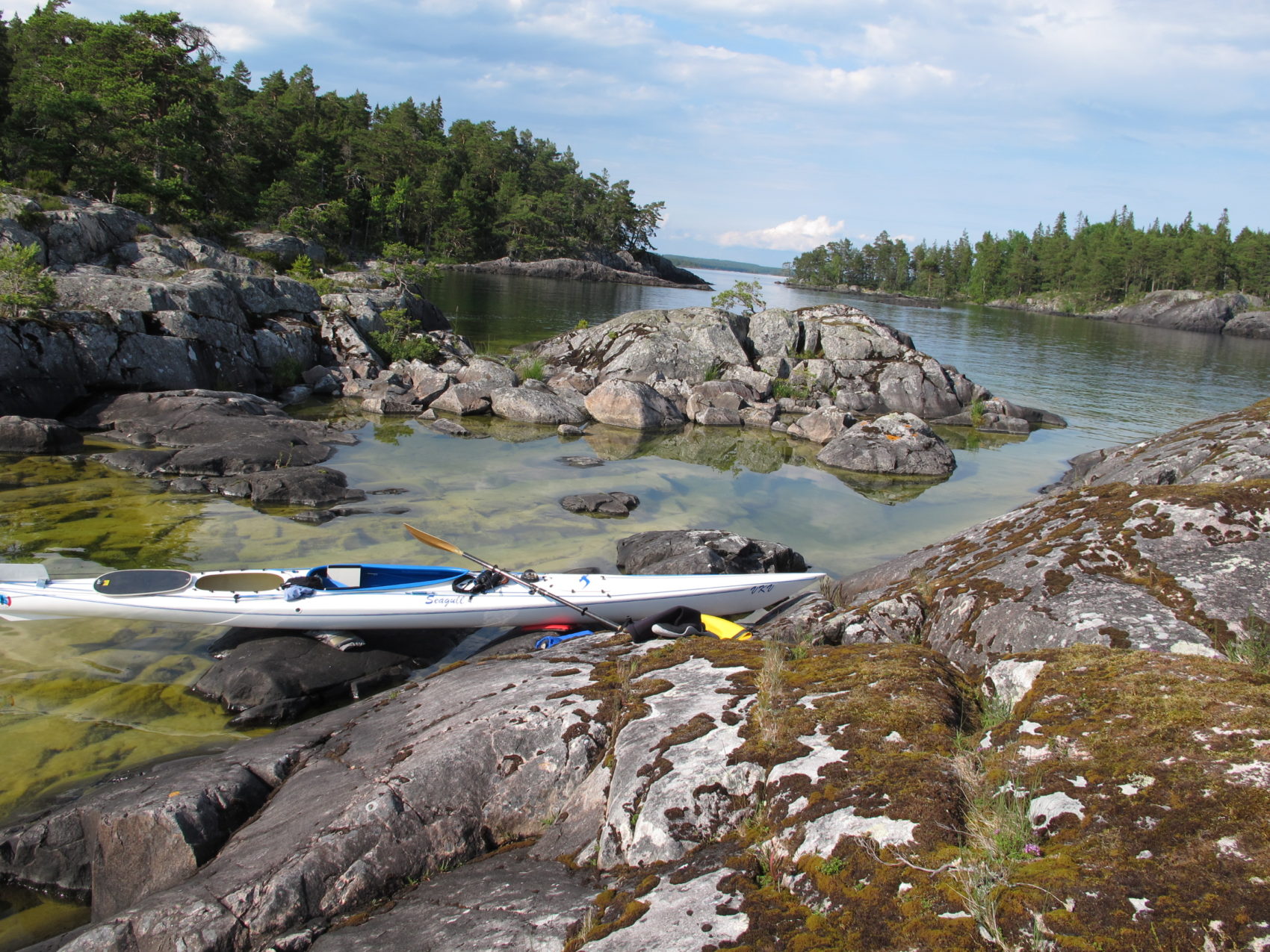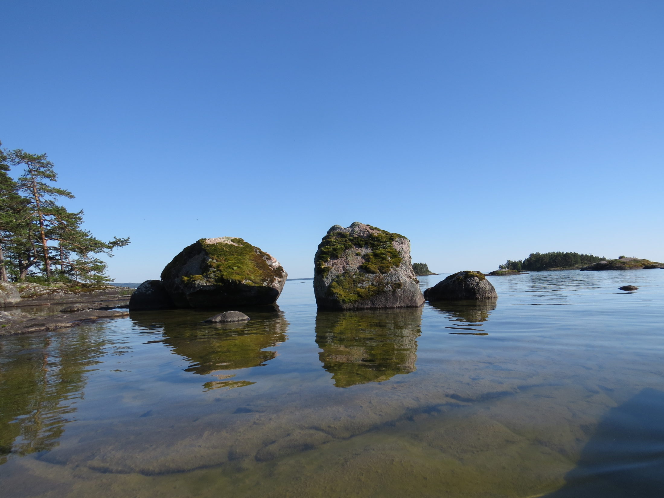 With weather conditions like that we were able to paddle among the outer islands and islets with open horizon. It gives a feeling of paddling in the sea. The transparent, crystal clear water shimmering in green made it possible to observe plants, stones, boulders and sandy bottoms. We even saw 25 quite big chars and a lot of small sticklebacks. Shallow places were of highest interest and we meandered in the most special surroundings.