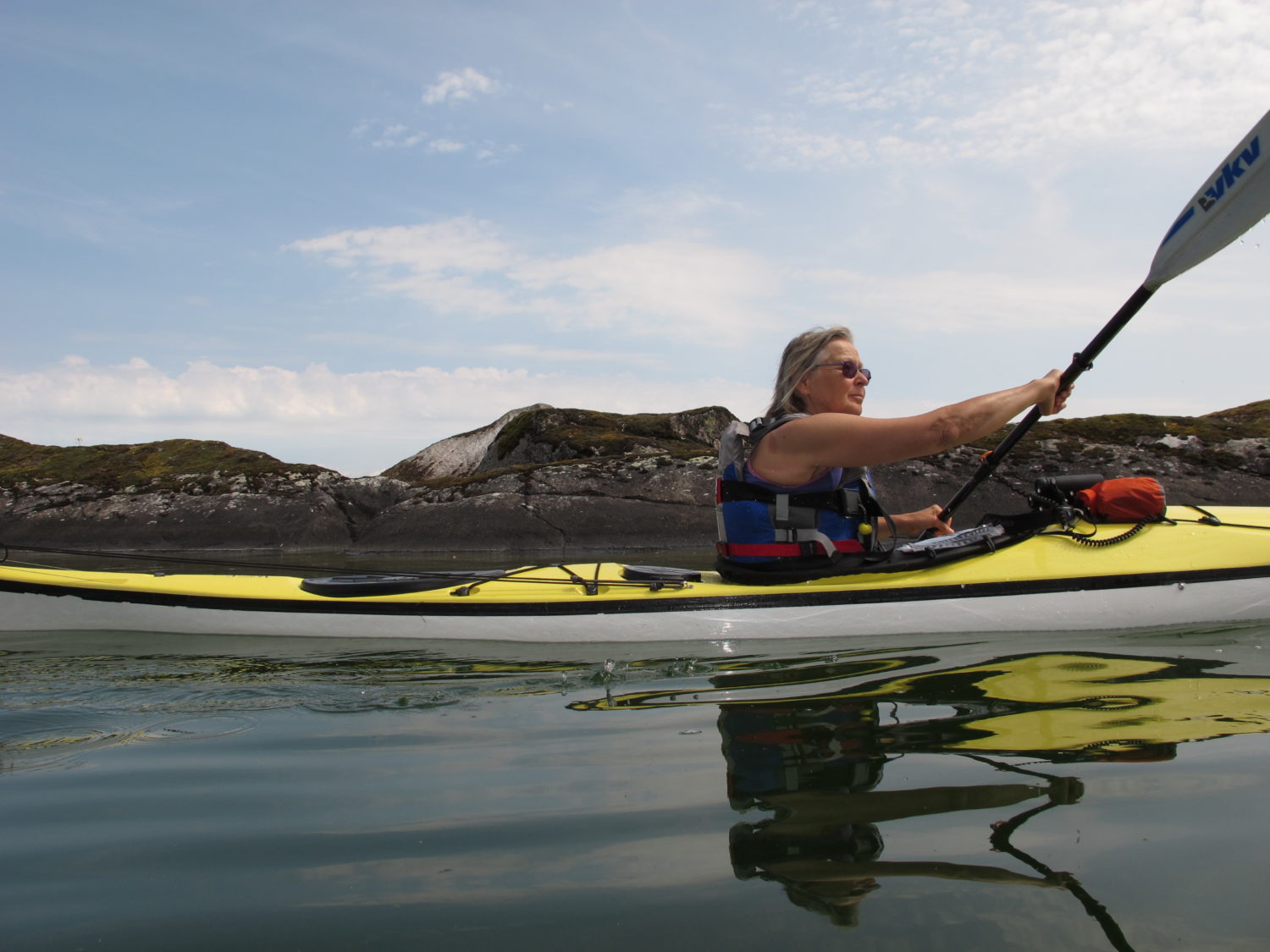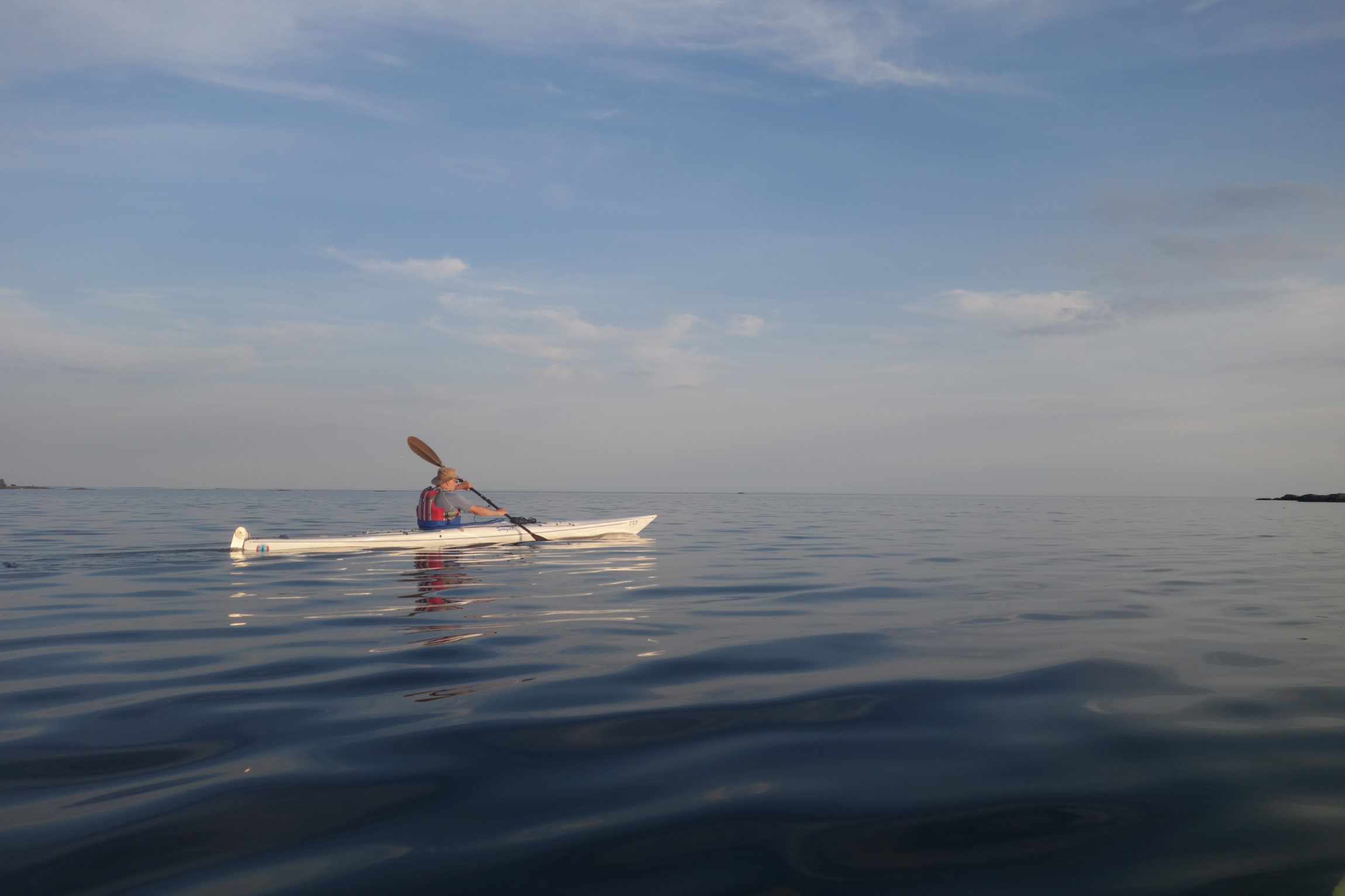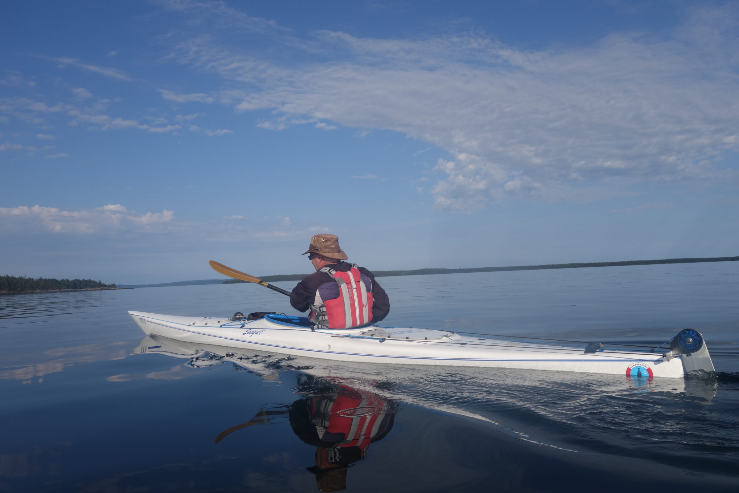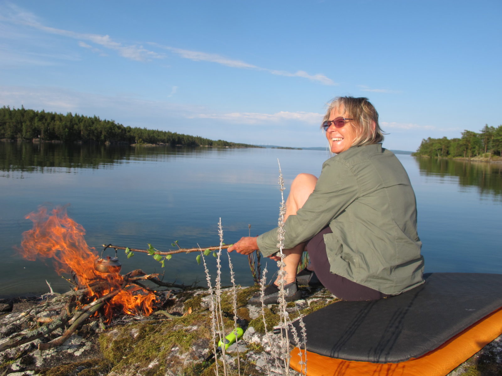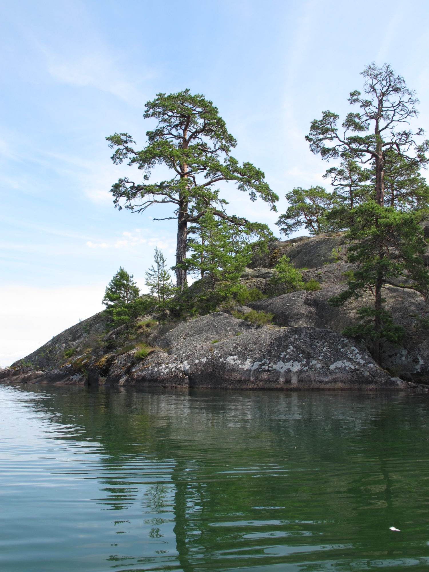 With weather conditions like that we were able to paddle among the outer islands and islets with open horizon. It gives a feeling of paddling in the sea. The transparent, crystal clear water shimmering in green made it possible to observe plants, stones, boulders and sandy bottoms. We even saw 25 quite big chars and a lot of small sticklebacks. Shallow places were of highest interest and we meandered in the most special surroundings.
