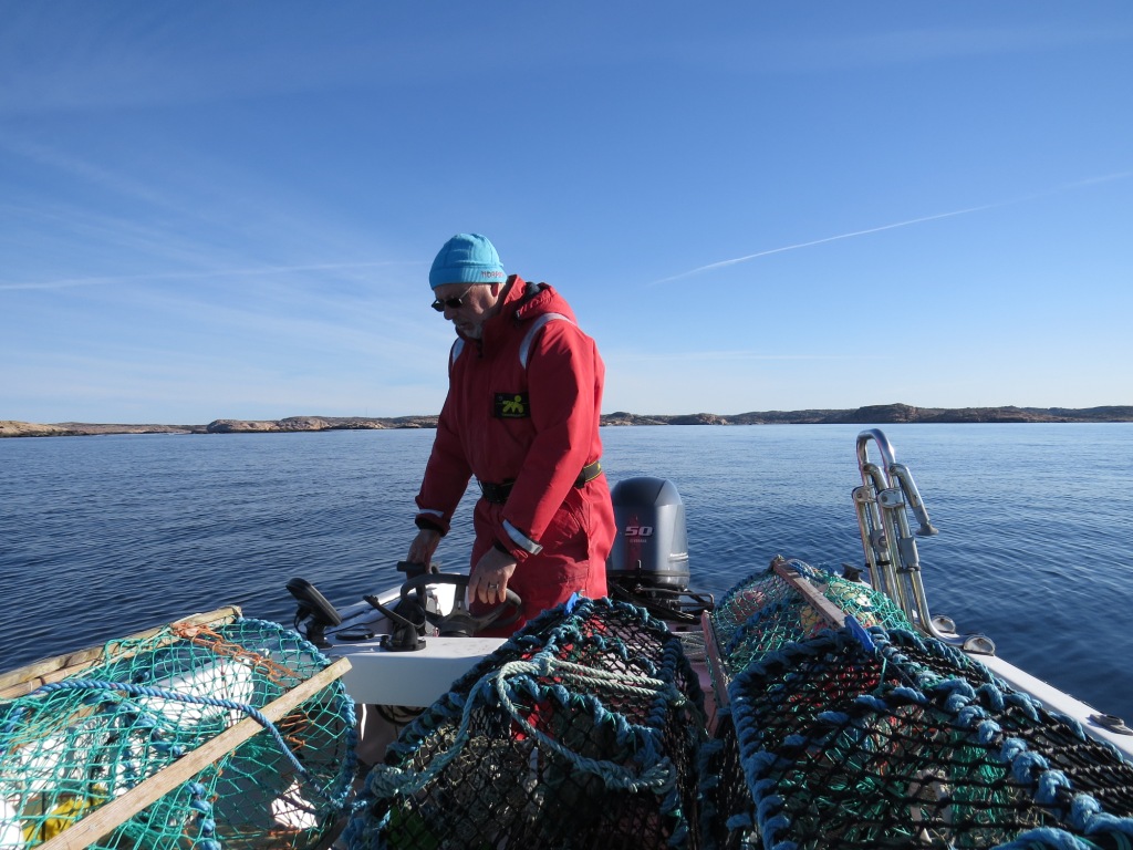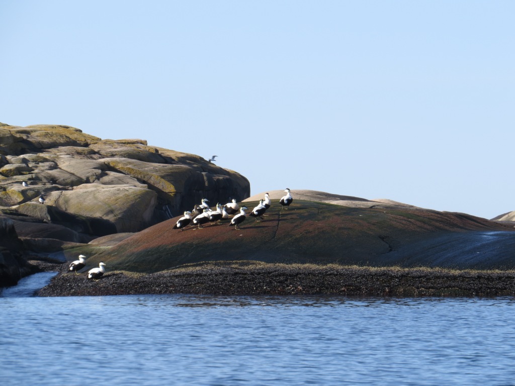 Lobster is allowed to catch from September till the end of April. These creatures live on the bottom of the sea and you get them on rocky seabeds in depth of 20 – 30 metres. We went out in hope to get our last lobster for this catching season. The sea was totally calm – the sunbeams glittered in the water and you felt the fresh air of spring. The birds were calling and singing looking for their partners. The most spectacular experience this morning was 13 male eiders who were fighting to get the attention to be chosen from one female eider. A real spectacle! On our way home we came across about 30 harbor seals who were lazing in the sun on the rocks. We studied them and after a while they one by one dived down in the water. A bit anxious but very curious.