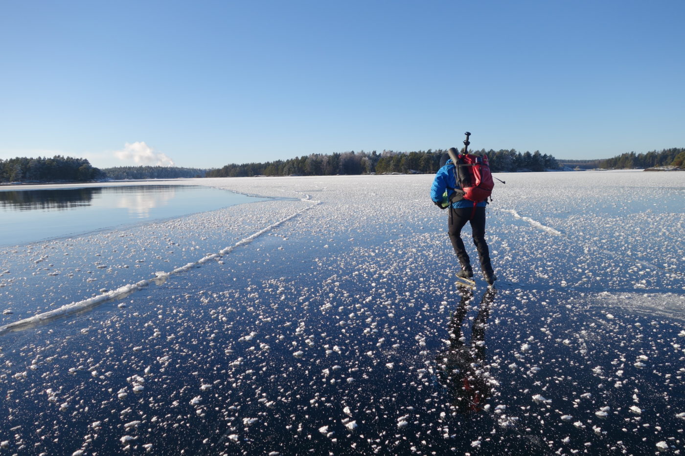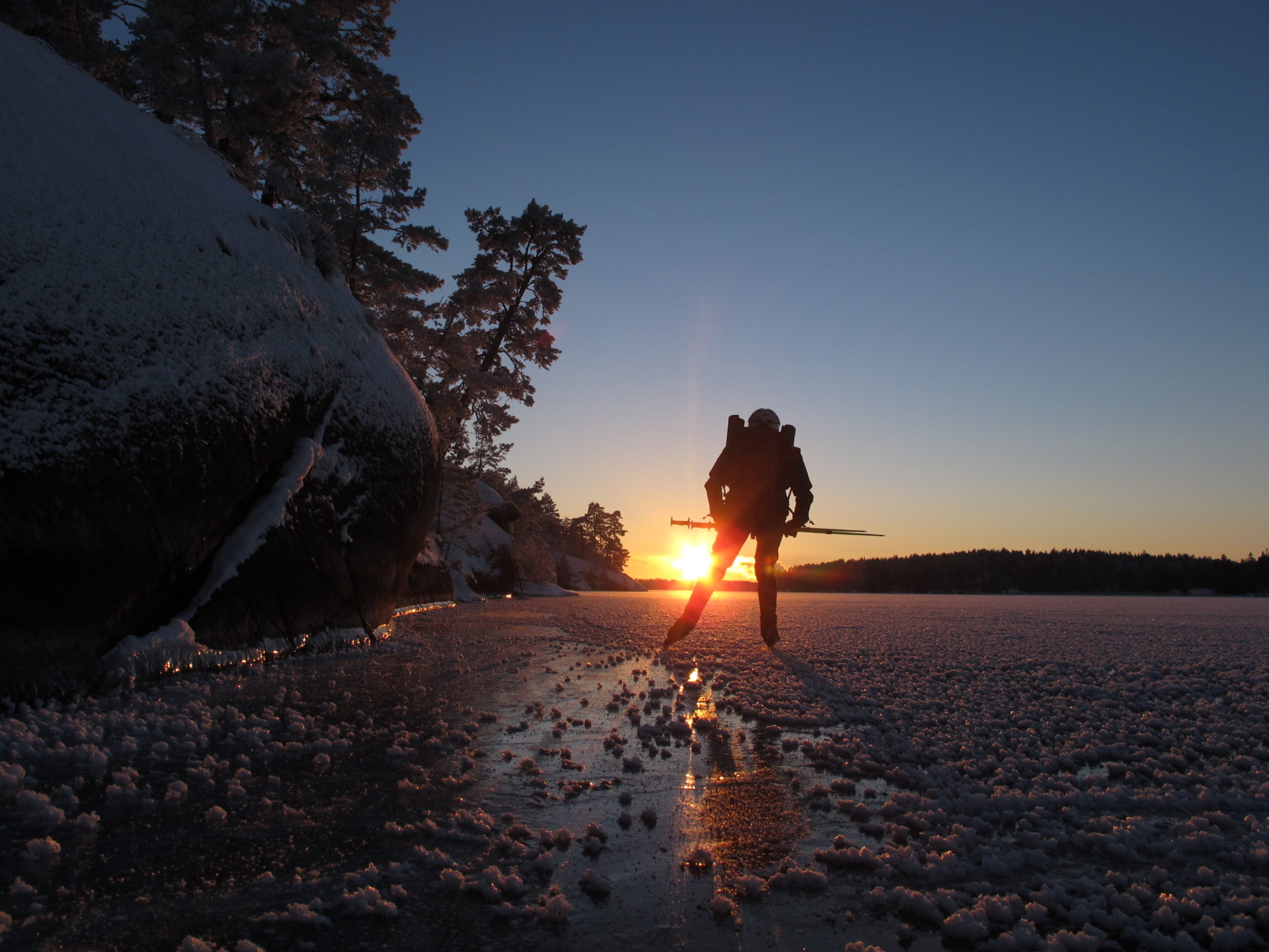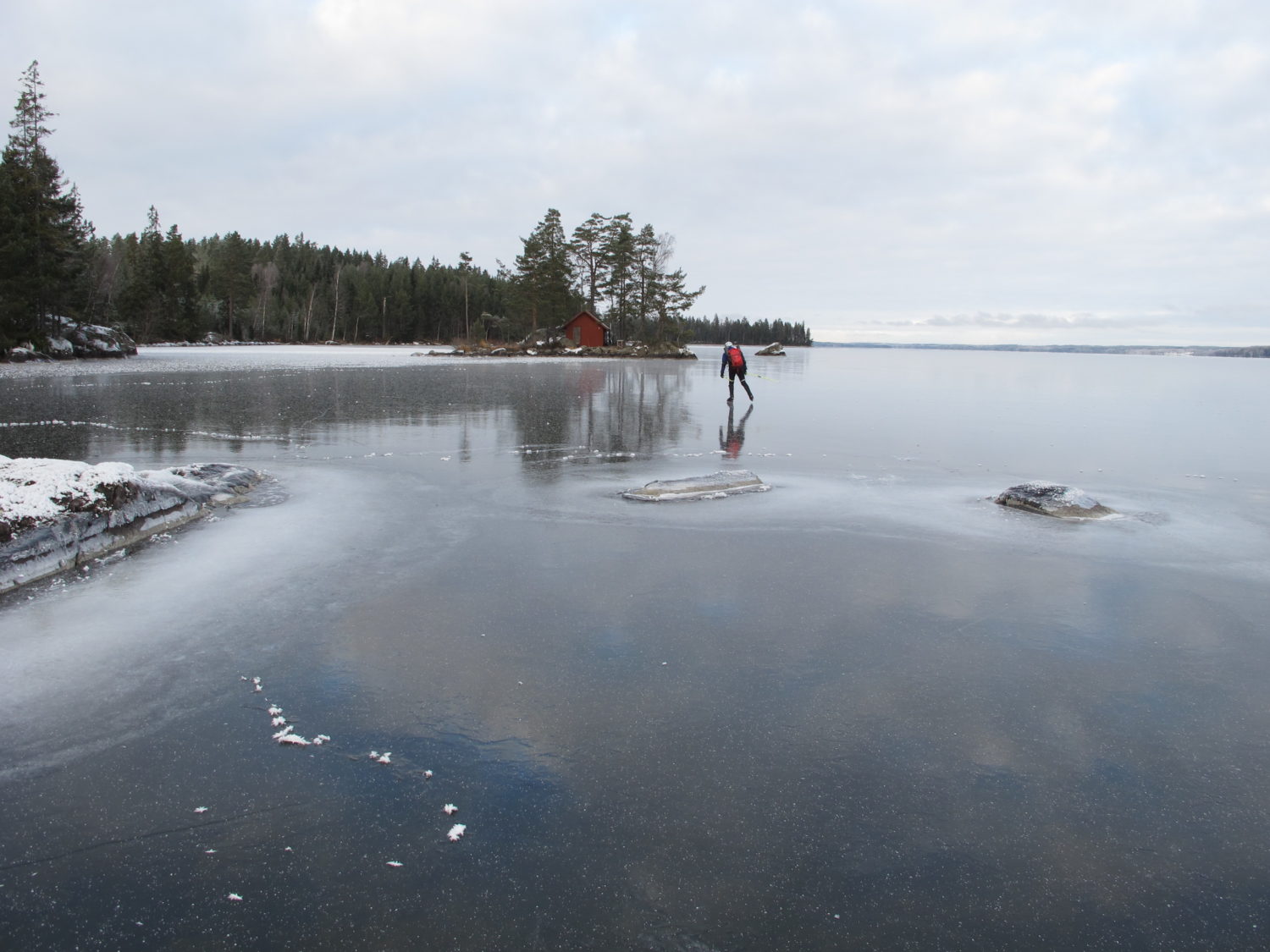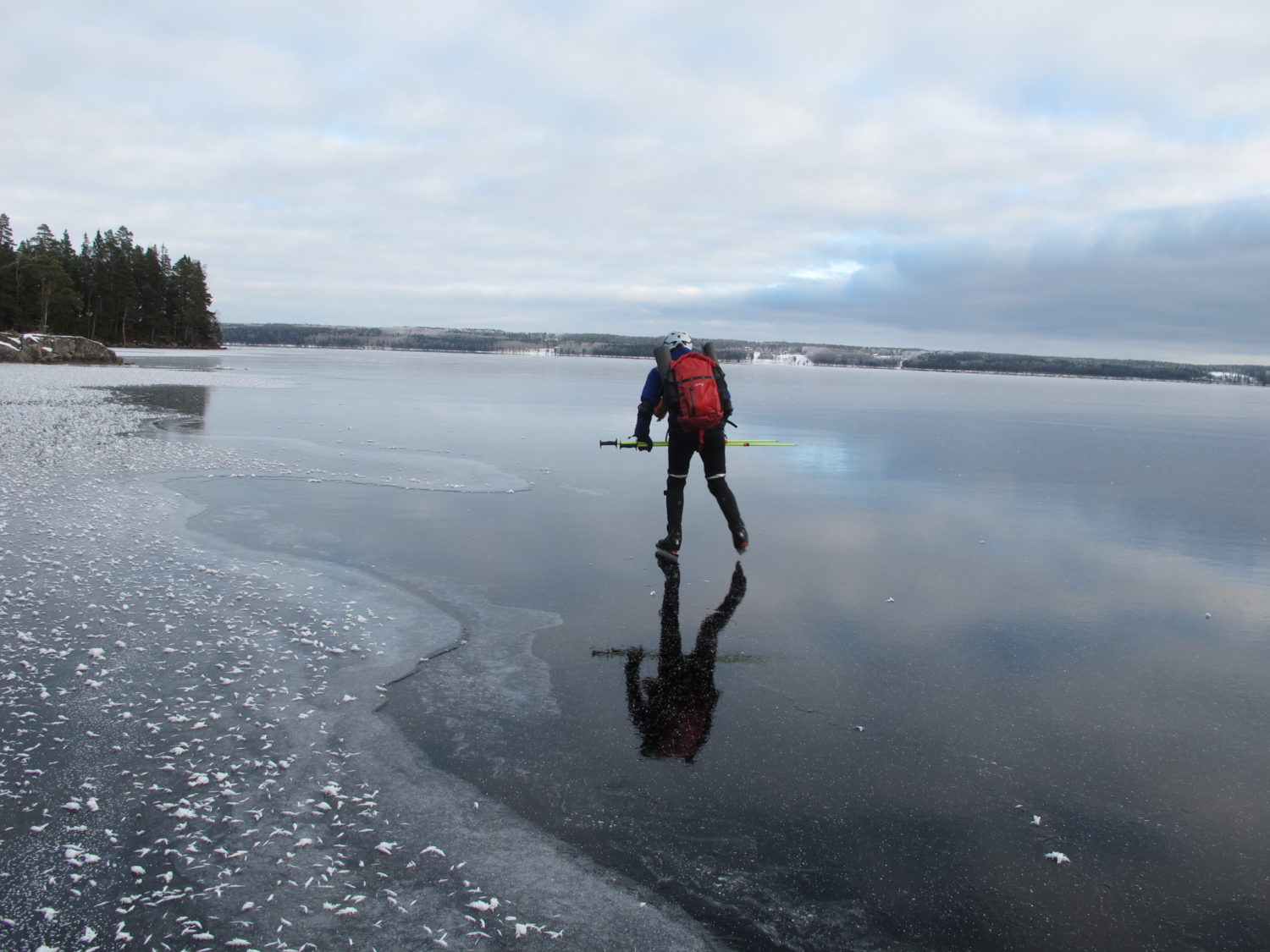 Follow the ice covering process on two of our favorite fresh water lakes in southern Sweden – Lake Vättern and Lake Unden. The photo galleries show last week’s trips on these lakes. We filled our senses with deep impressions from dusk to dawn. Different ice conditions challenged our minds to be alert and alive. The skating technique, pending from one side to another in a smooth rhythm offers great harmony. Starting from the shore on old thick ice covered with dense frostwork, finding our way on safe newer generations with smooth black ice out to the ice front with open water gives variety and a lot of adrenaline.