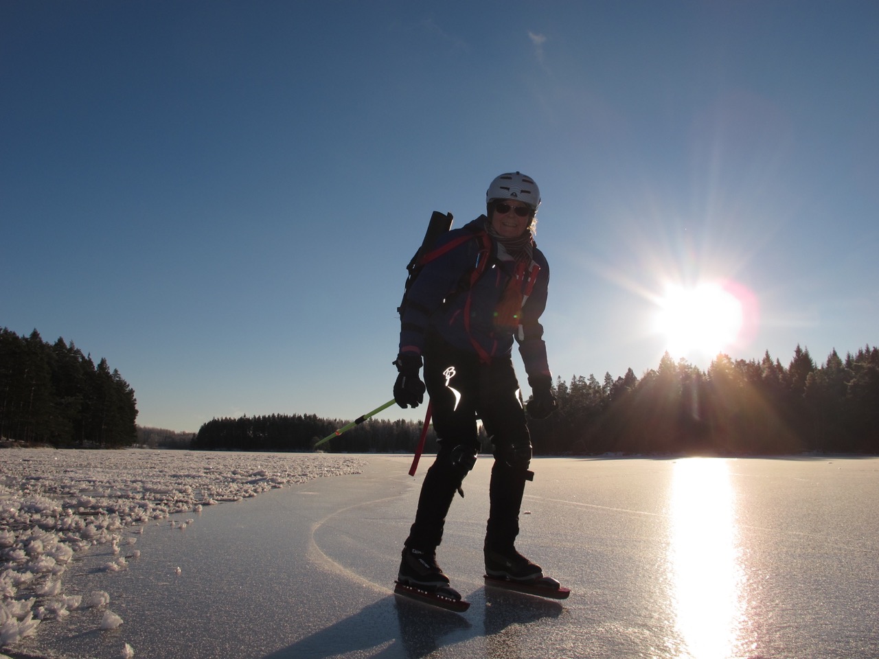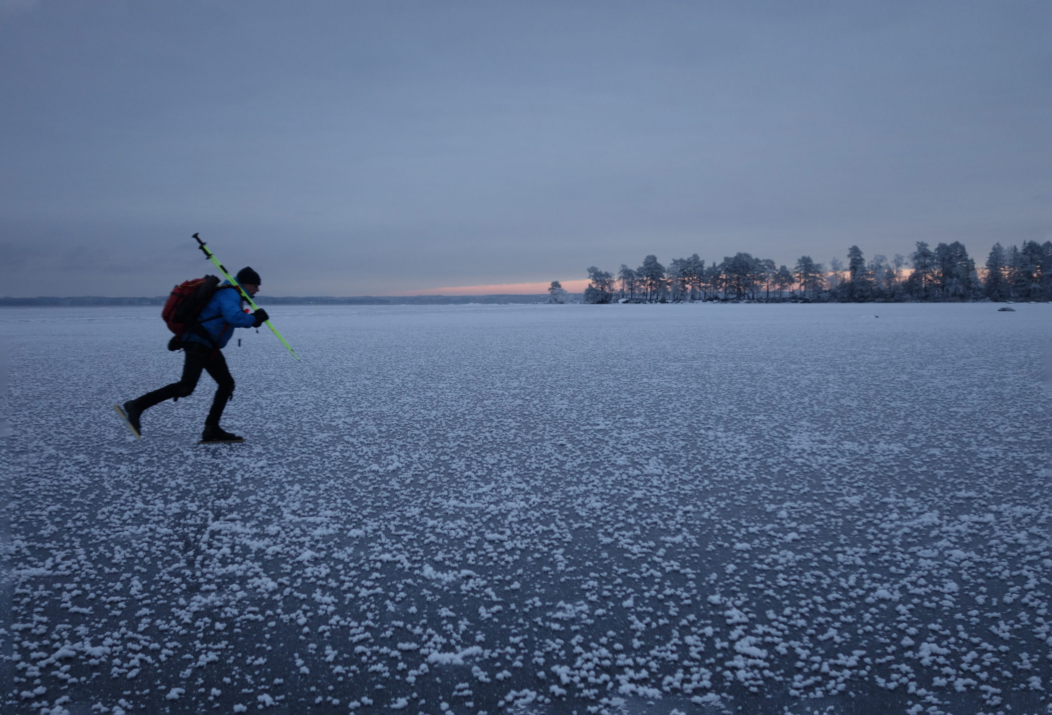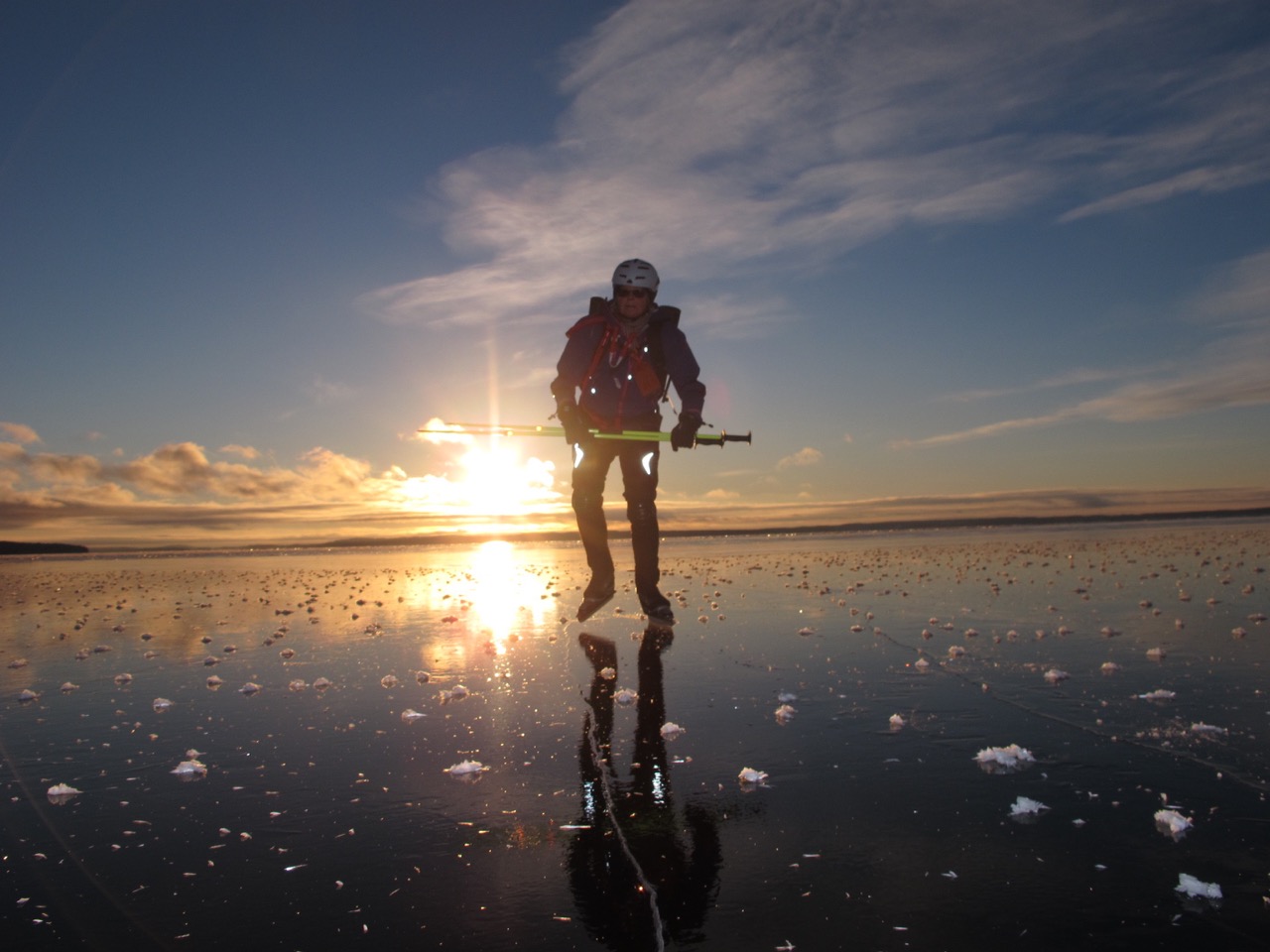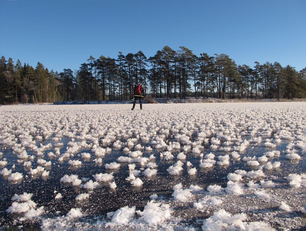 Follow the ice covering process on two of our favorite fresh water lakes in southern Sweden – Lake Vättern and Lake Unden. The photo galleries show last week’s trips on these lakes. We filled our senses with deep impressions from dusk to dawn. Different ice conditions challenged our minds to be alert and alive. The skating technique, pending from one side to another in a smooth rhythm offers great harmony. Starting from the shore on old thick ice covered with dense frostwork, finding our way on safe newer generations with smooth black ice out to the ice front with open water gives variety and a lot of adrenaline.
