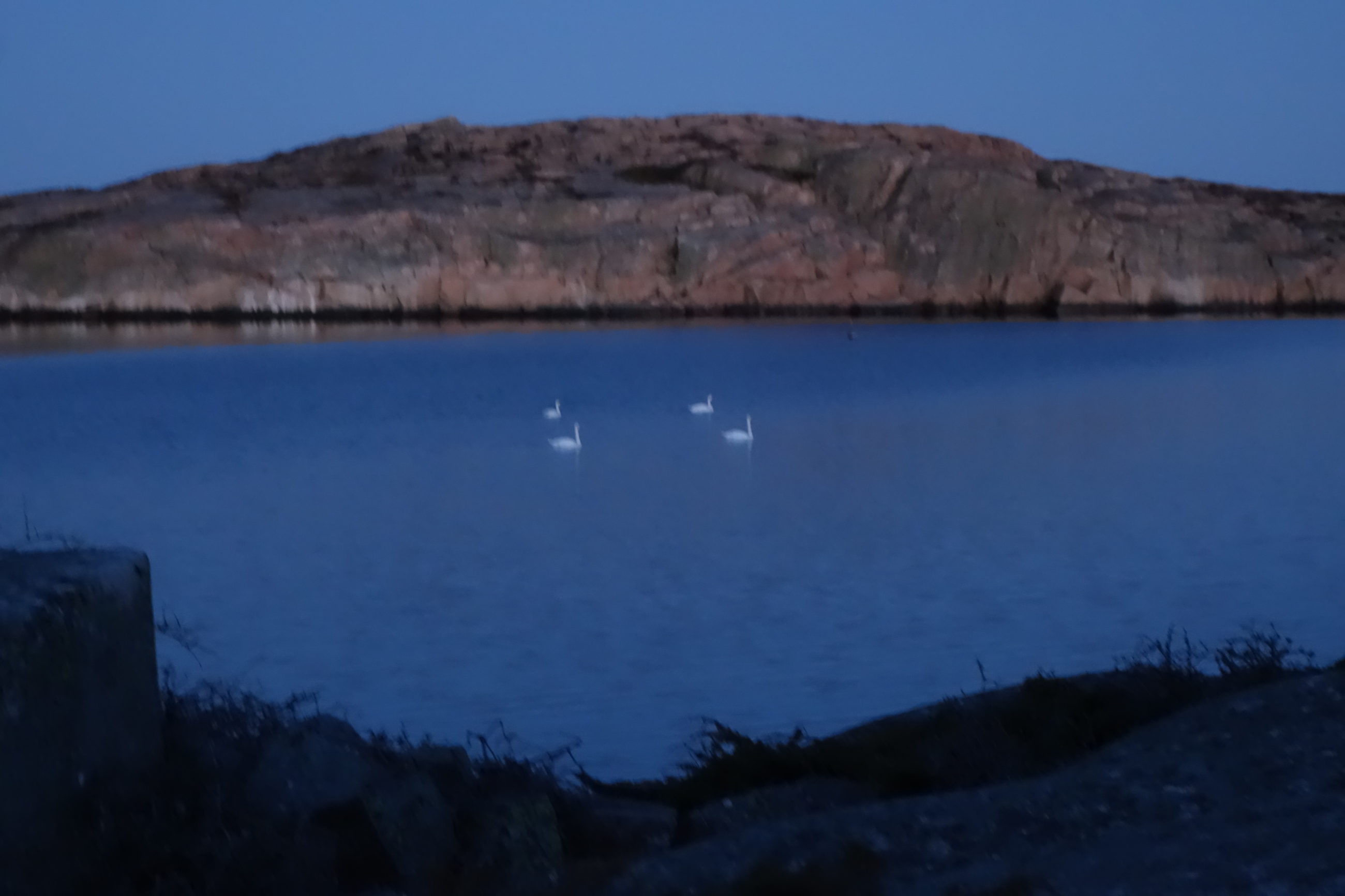 The archipelago was even quieter in the setting sun. We saw the sun descend in the horizon before heading ashore. The last birds we saw before dark were four silent swans ready for the night.